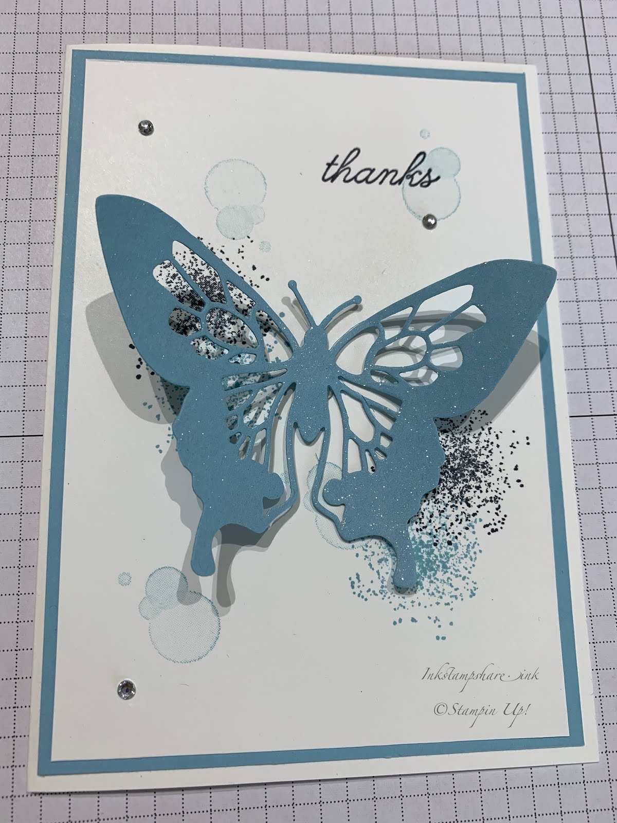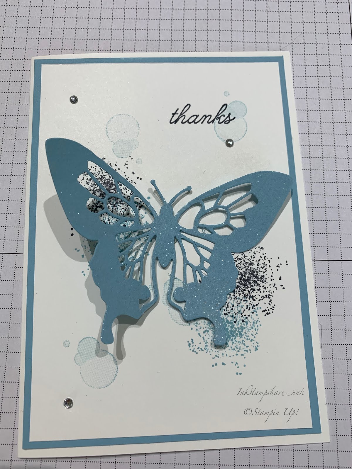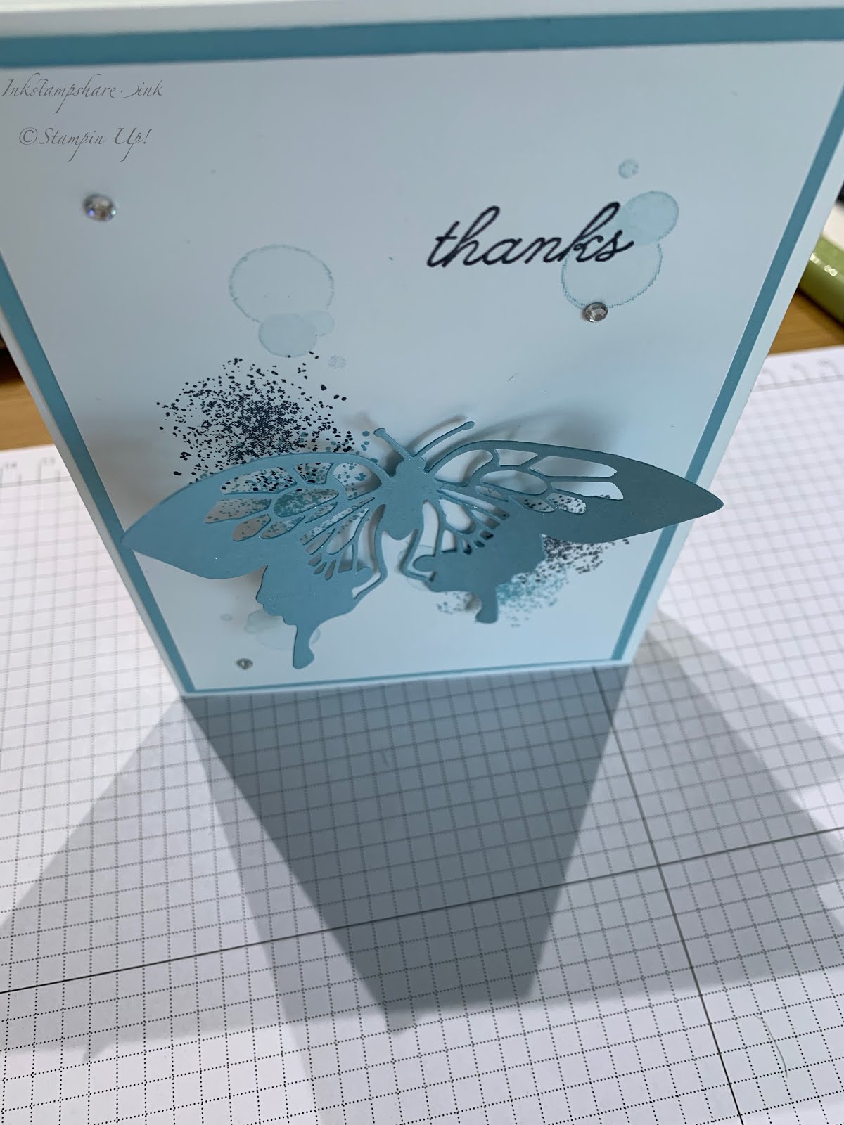 Some simple stamping in Balmy Blue to match the card stock and Memento Black using the Beauty Abounds stamp set and then adhered the butterfly in the middle with a glue dot to leave the wings free to curl up a little.