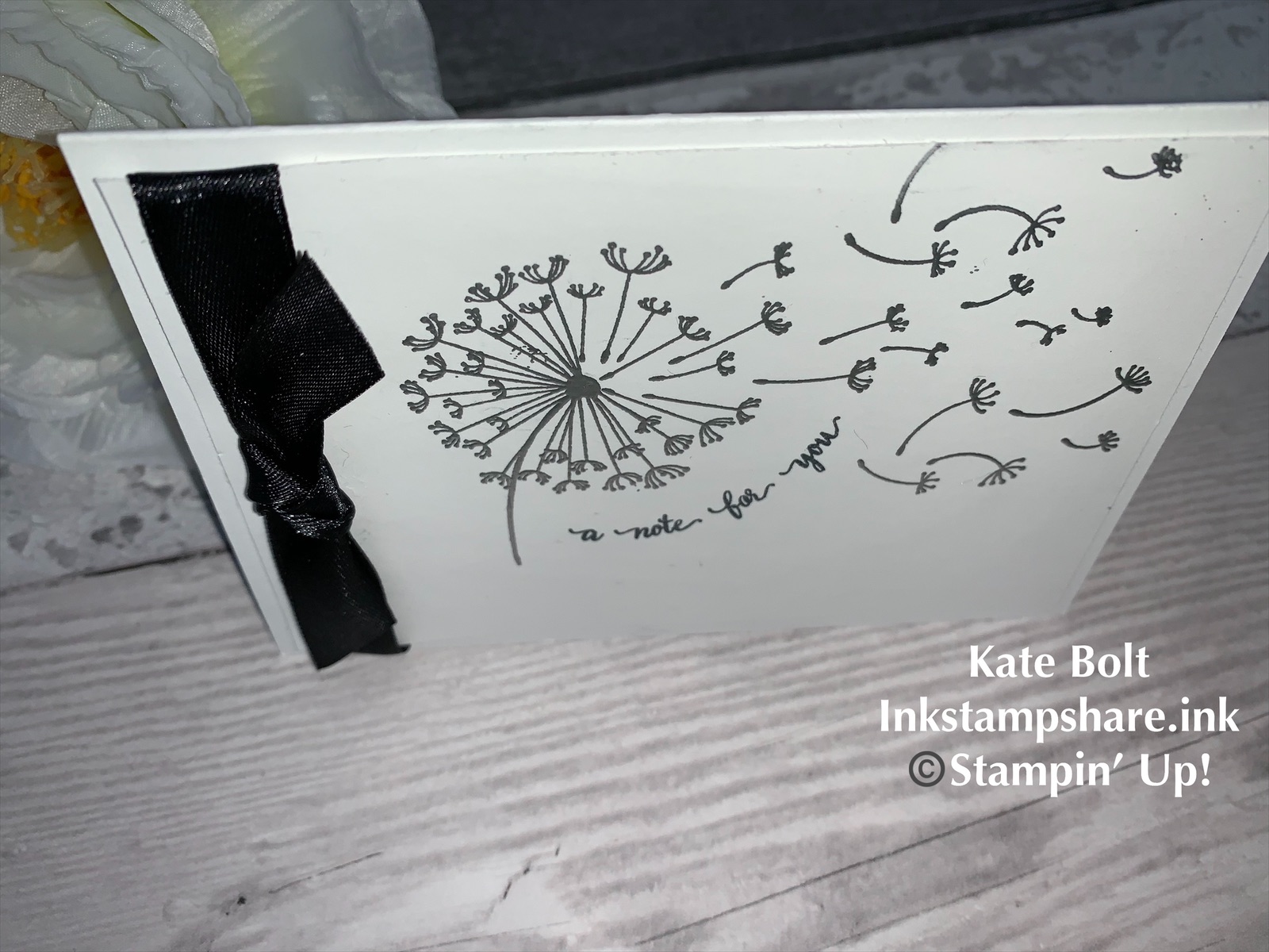 I added the “a note for you” from the Eastern palace stamp set in Black. I wanted to see how the curve in the stamp would look like under the dandelion head. I love it! And I love the font in this stamp set too.