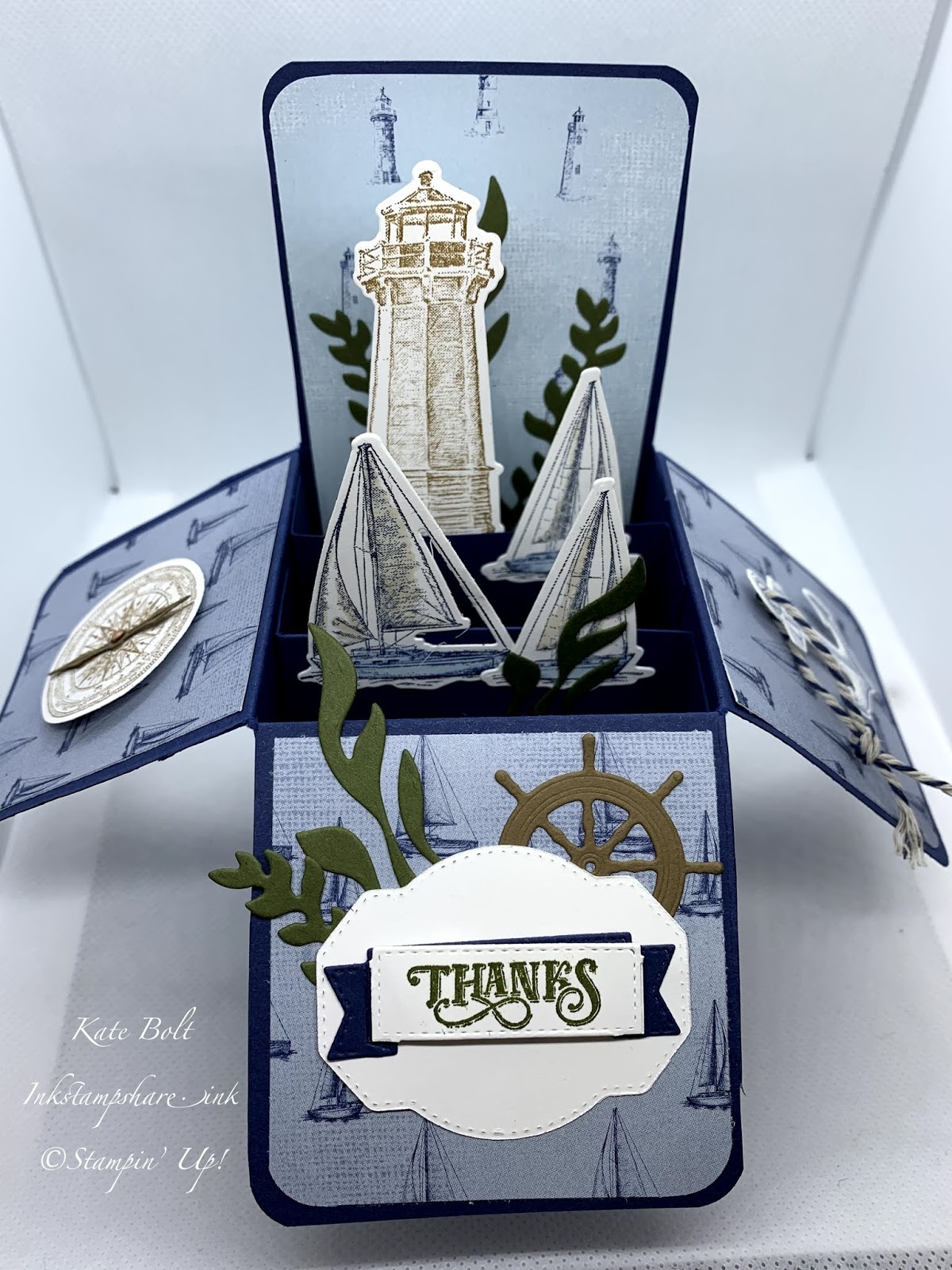 My fabulous team leader Michelle Last showed us how to make this type of card last autumn at a team event using the cute snowmen we had in the Christmas catalogue. I loved it and when I saw the Sail Away Suite in the new Annual catalogue I thought it would look great with the boats sailing in it. The Sail Away stamps and dies have gorgeous matching papers, perfect for this project.
